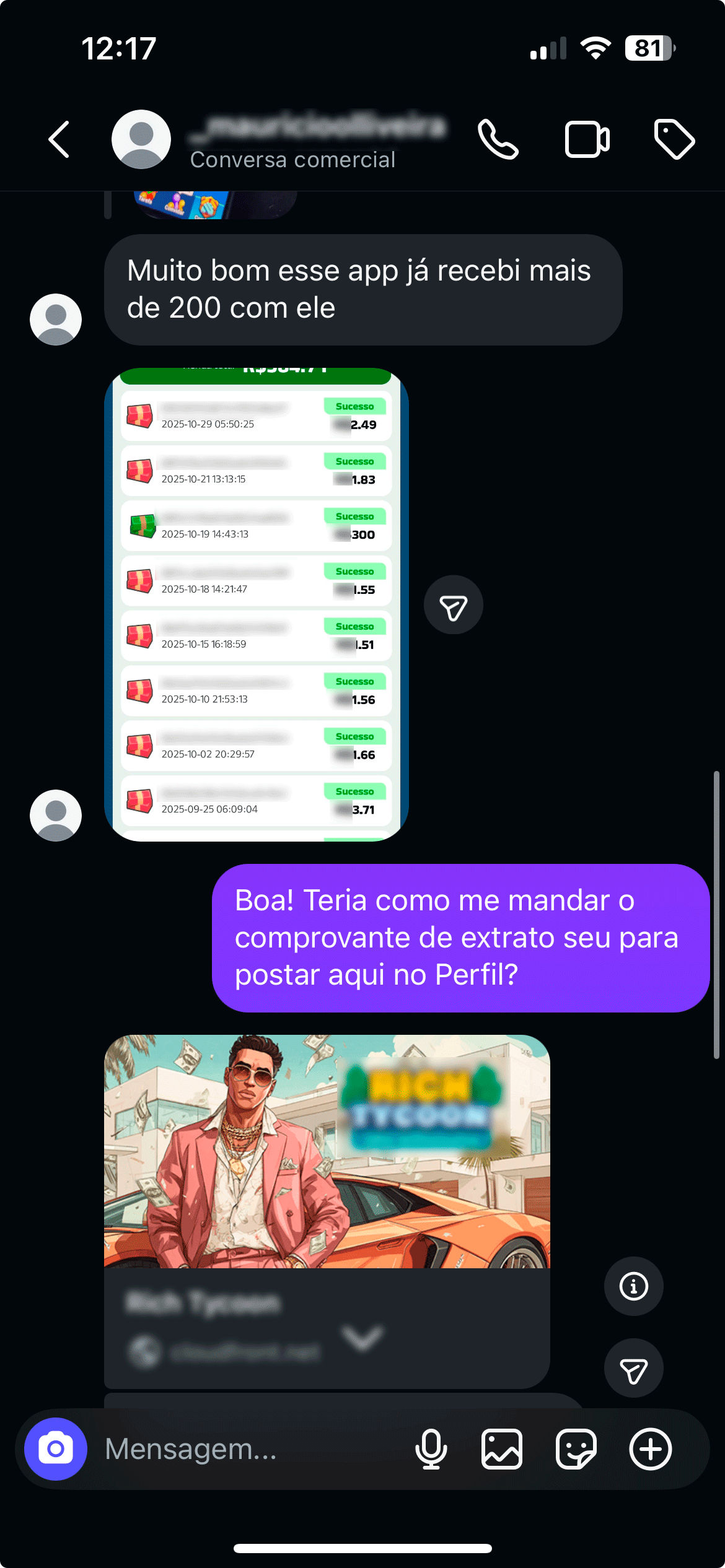 Sim, o Rich Tycoon já pagou em testes reais. Um seguidor da nossa comunidade enviou prints com vários saques aprovados, incluindo um de R$300, além de diversos valores menores como R$2,49 / R$1,83 / R$1,55 / R$3,71 e outros.