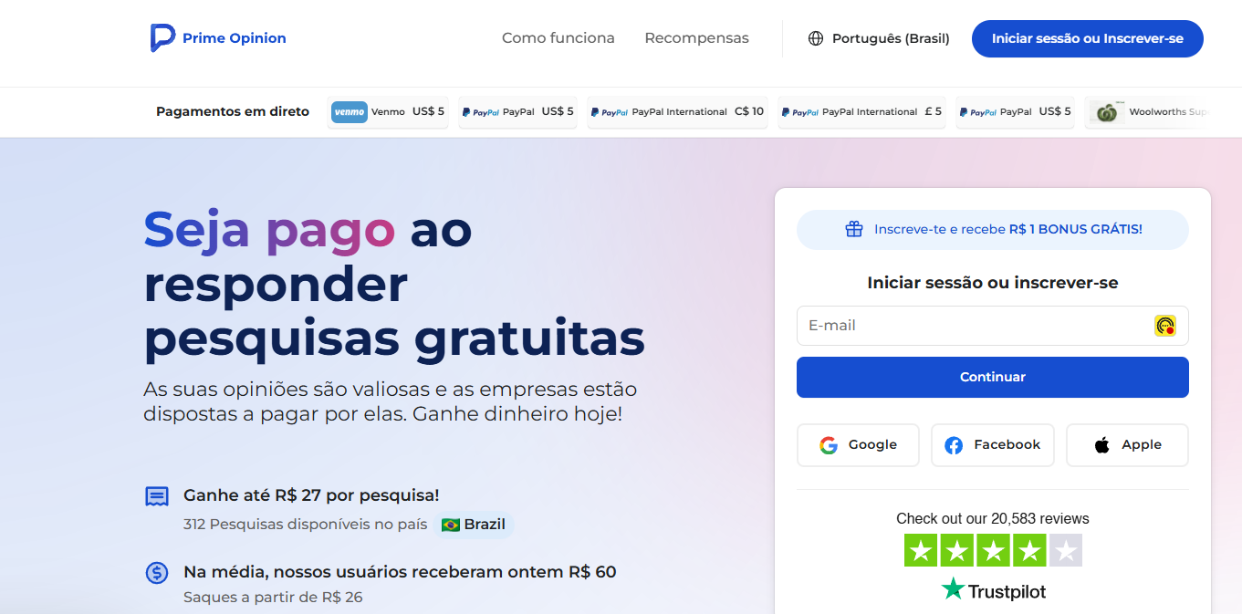 O Prime Opinion é um site de pesquisas remuneradas que promete pagar para usuários responderem questionários online. Ele ganhou destaque no Brasil recentemente, oferecendo valores atrativos e saques rápidos via PayPal e outros meios de pagamento. Mas será que é confiável? E realmente paga o que promete?